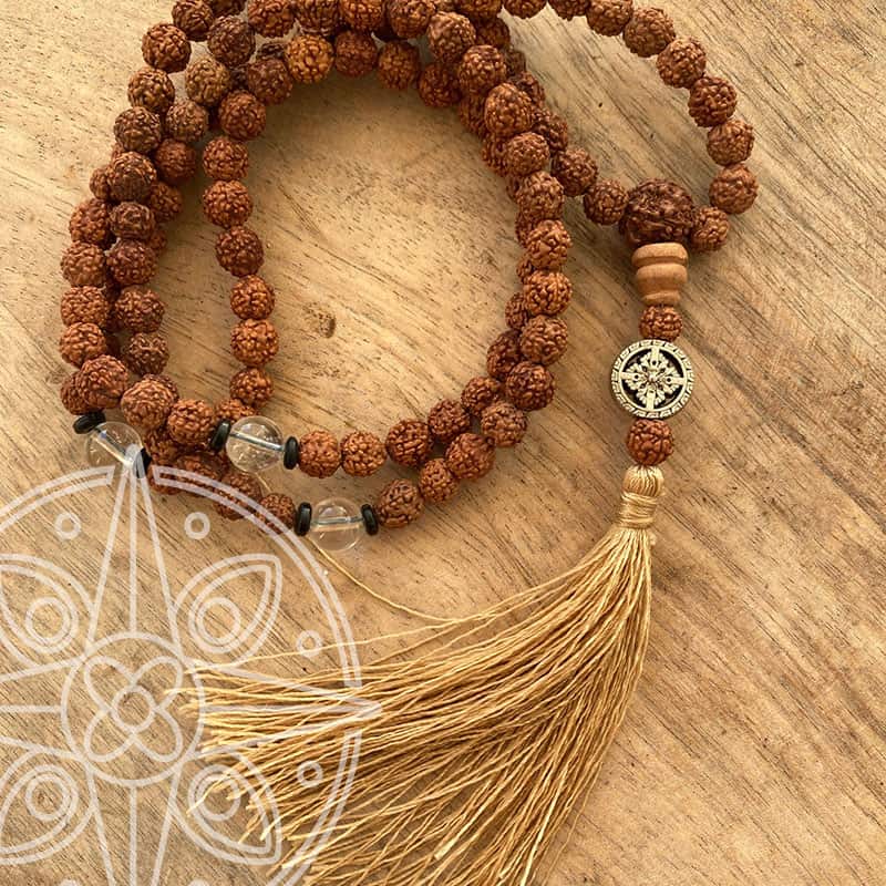 Hecho a mano con 108 semillas del árbol sagrado de Rudraksha, que promueve la sabiduría y la paz mental. Este japamala, tiene el símbolo del nudo infinito, un trazado de líneas que nos recuerda que todos los fenómenos dependen y se relacionan entre sí mediante la ley de causa y efecto o Karma. También, el nudo infinito, hace referencia al conocimiento infinito y permanente de Buda. Nos ayuda a mantenernos sólidos y centrados aún en tiempos adversos.